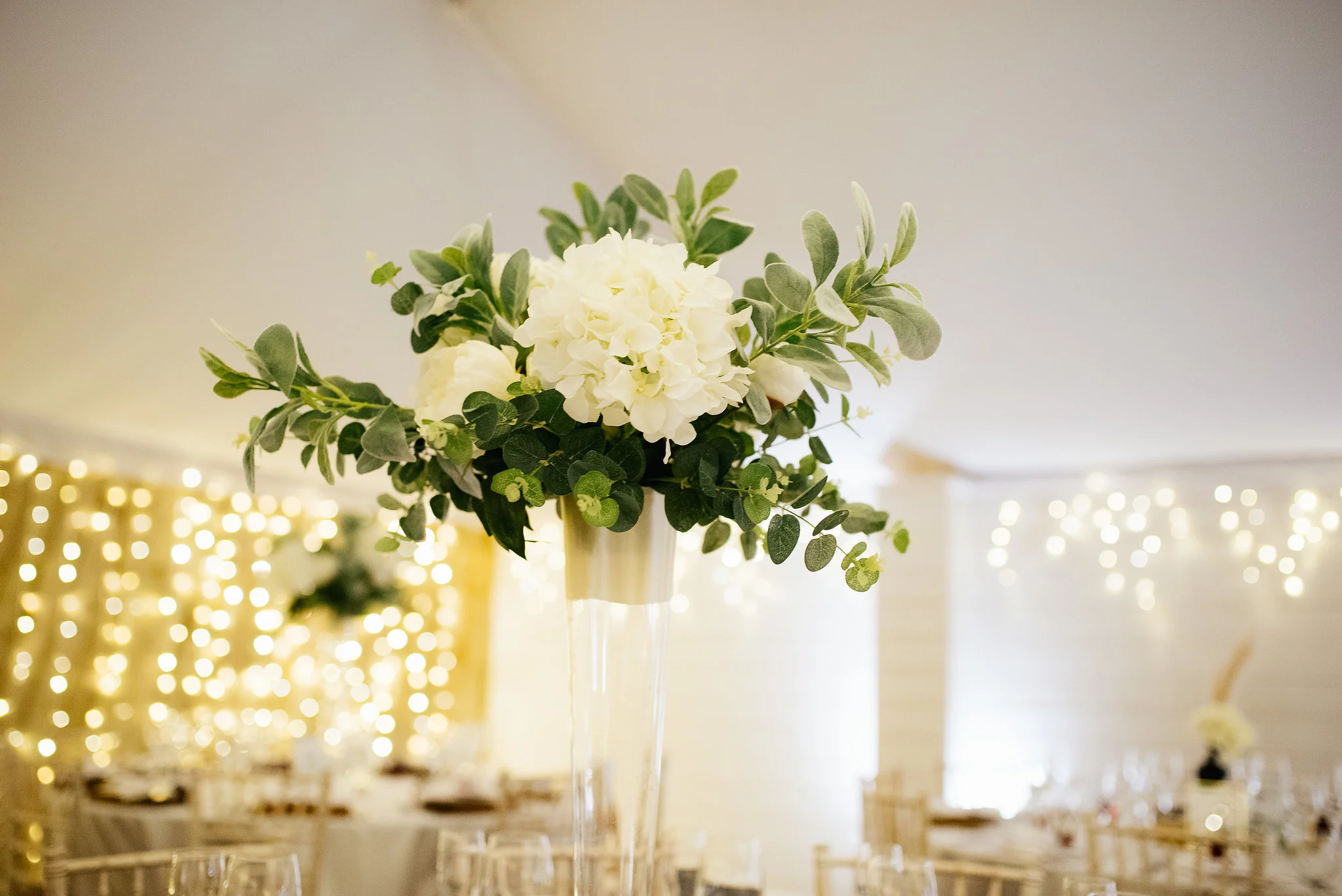 With everyone wedding-ready, The Normans Ceremony Barn welcomed guests with warm candlelight and white flora and greenery - ivy, eucalyptus and pampass grass among them - by Serendipity Floral Design